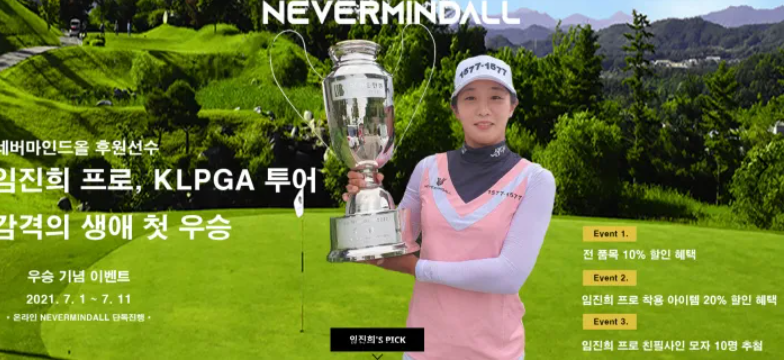 골프의류 브랜드 네버마인드올이 후원 프로골퍼 임진희(23) 우승 기념 이벤트를 진행한다. 네버마인드올 제이제이스튜디오(대표 김진효)는 1일부터 11일까지 온라인 몰을 통해 이벤트를 진행한다. 행사 기간에는 네버마인드올 전 제품을 10% 할인 가격으로 구매할 수 있다. 임진희가 착용한 제품들은 20% 할인 혜택이 주어진...